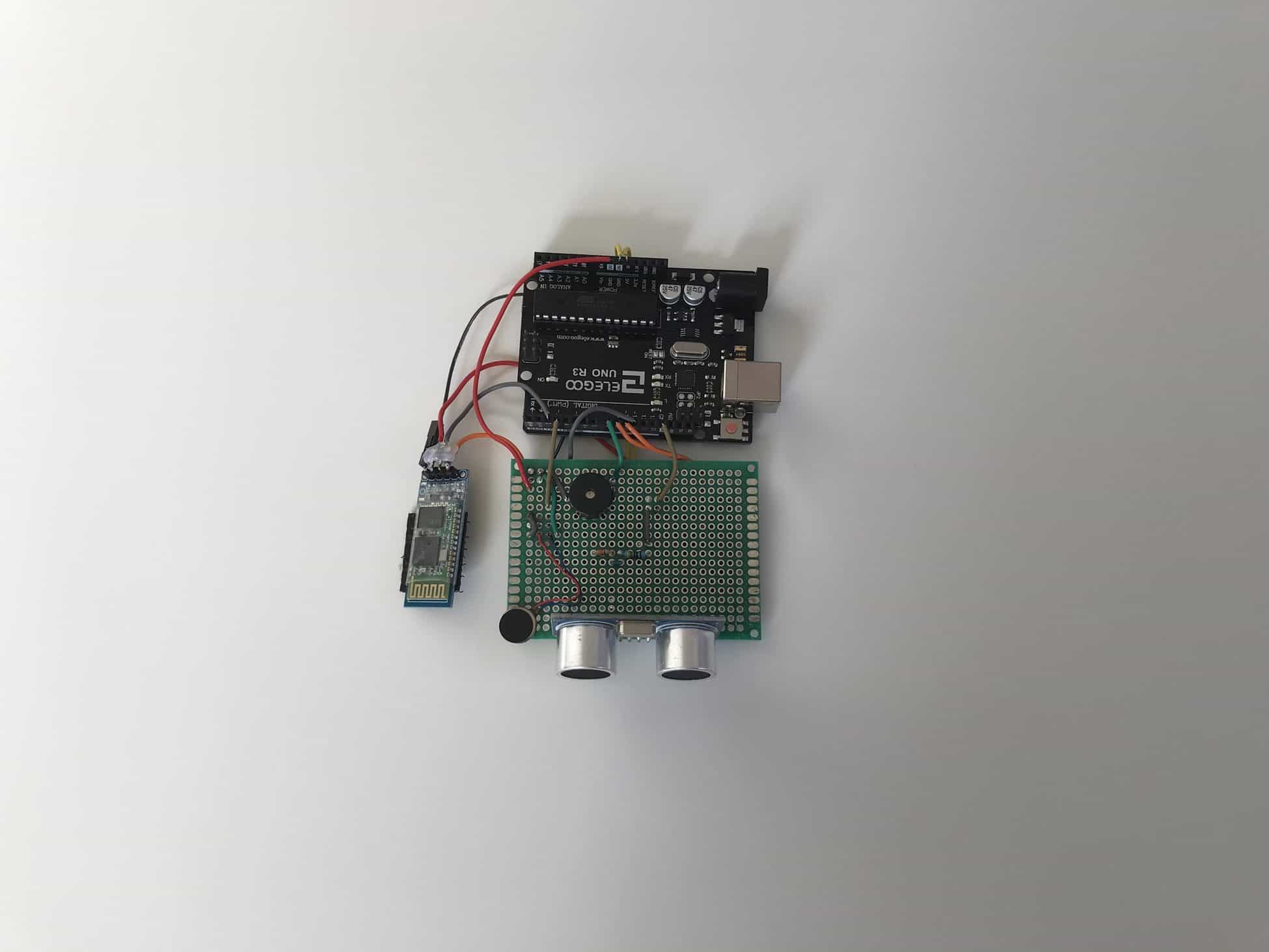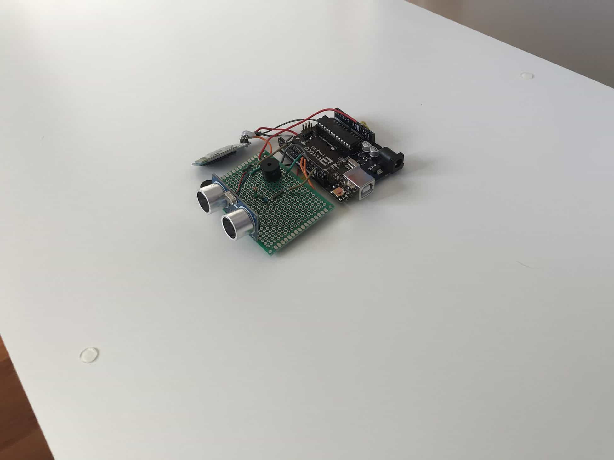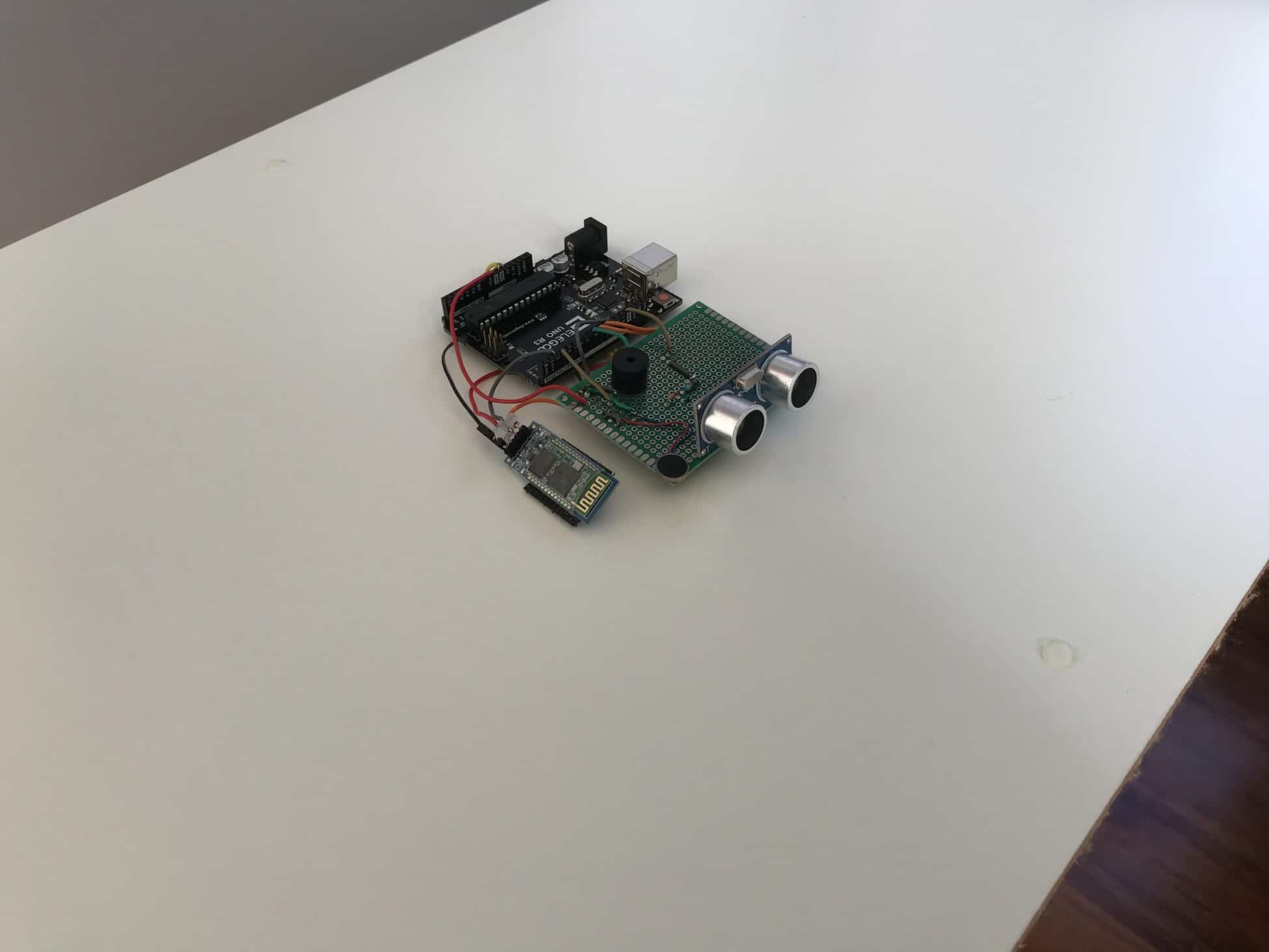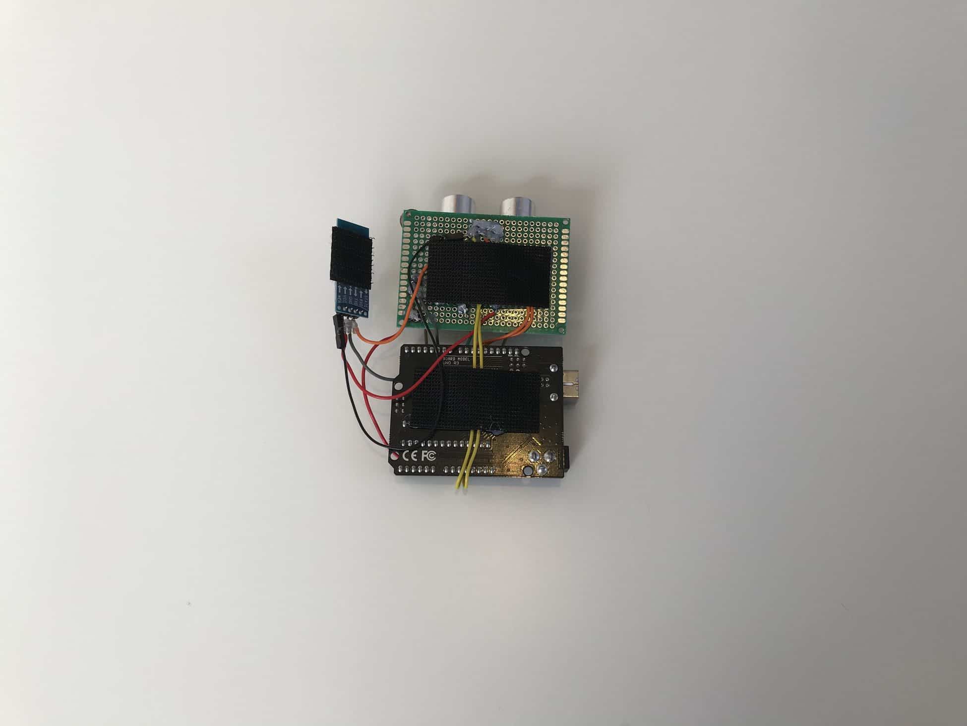 I started by soldering the ultrasonic sensor onto the perfboard and then soldering 4 jumper wires onto the 4 pins of the ultrasonic sensor, which would connect directly into the GND, VCC, TRIG, and ECHO pins on my Arduino. Once the ultrasonic sensor was securely soldered, I moved throughout the perfboard, trying my hardest to replicate the circuits and connections from my breadboard. After soldering for what felt like many hours, I began feeling like a surgeon, carefully and precisely connecting delicate jumper wires with scolding metal through roughly 0.042 inch diameter holes––my pair of tweezers and forceps certainly added to the surgeon persona I was imagining.