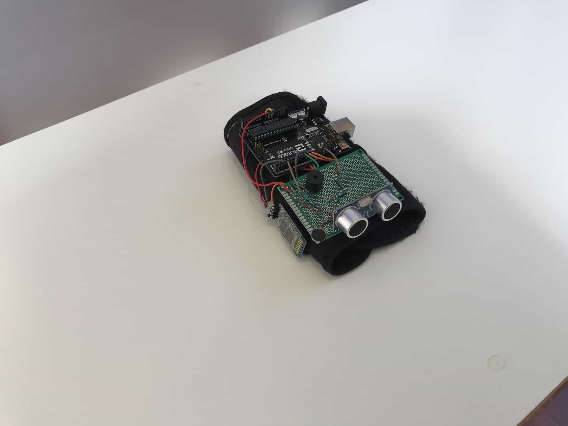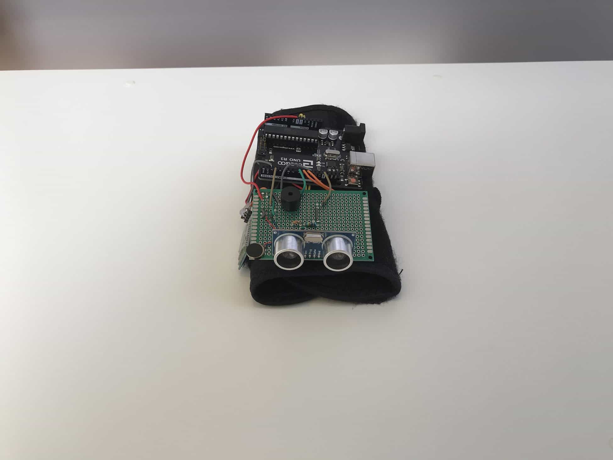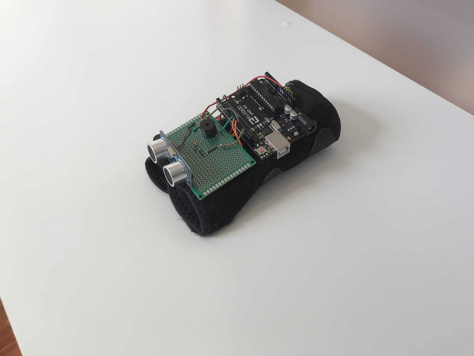 In order to maximize the potential reach of the ultrasonic sensor while maintaining a seamless design, I attached the Third Eye device to a wrist brace, and placed the ultrasonic sensor at the base of metacarpophalangeal joints, just below the fingers. Since the metacarpophalangeal joints are near the lowest point on the arm, swinging and swaying while walking will have an even more dramatic effect on the range of the ultrasonic sensor. In addition, I deliberately placed the ultrasonic sensor on the top side of the hand so as to leave the user’s palm available and free of limitations.