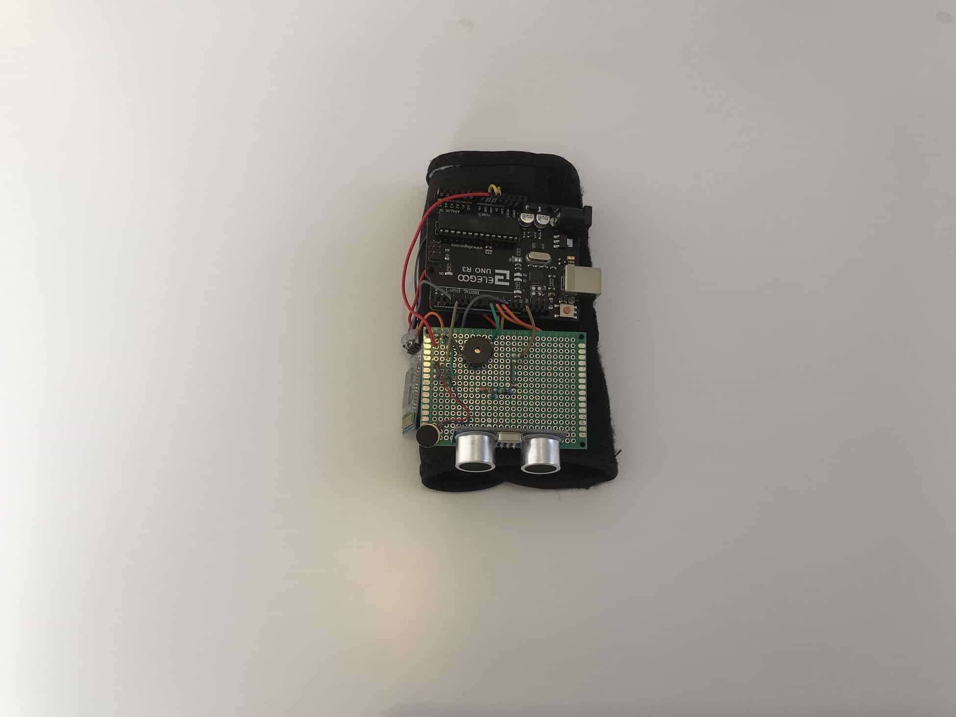 After verifying that the soldered connections were functioning as intended, I attached strips of velcro onto the wrist brace and the device itself. The perfboard, Arduino, and HC-06 module were then strapped to the wrist brace using a total of 6 strips of velcro: 1 on the perfboard, 1 on the Arduino, and 1 on the HC-06 bluetooth module––and of course the counter parts to those pieces of velcro were placed accordingly on the wrist brace. Before slipping into the wrist brace, I tested all of the connections and confirmed that the Third Eye device was working flawlessly.