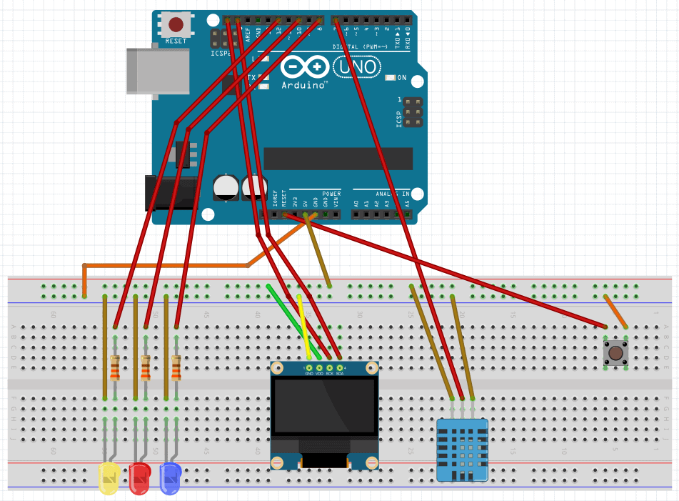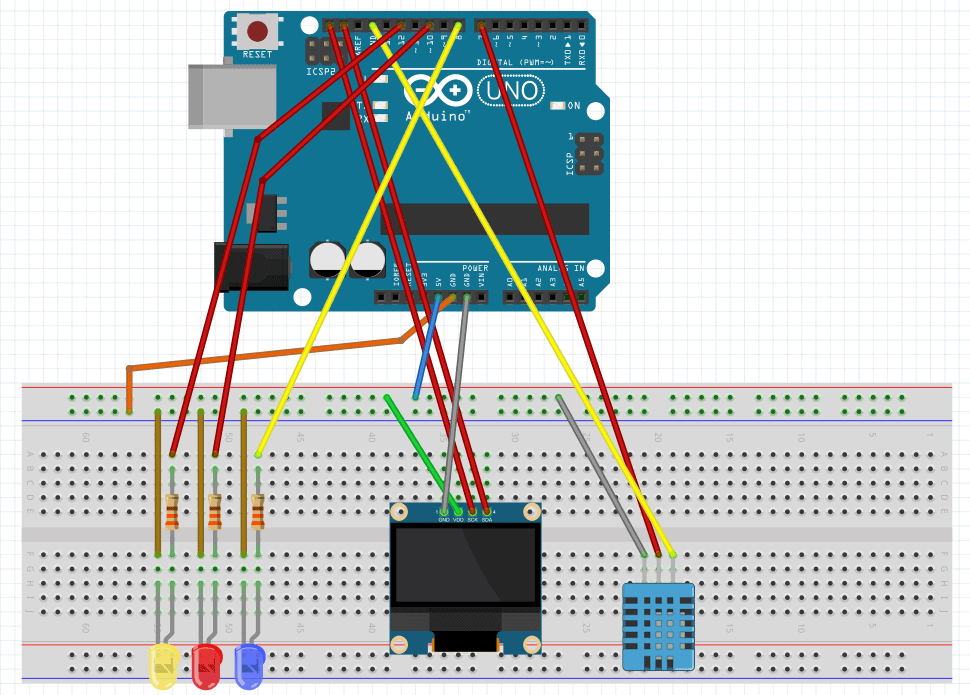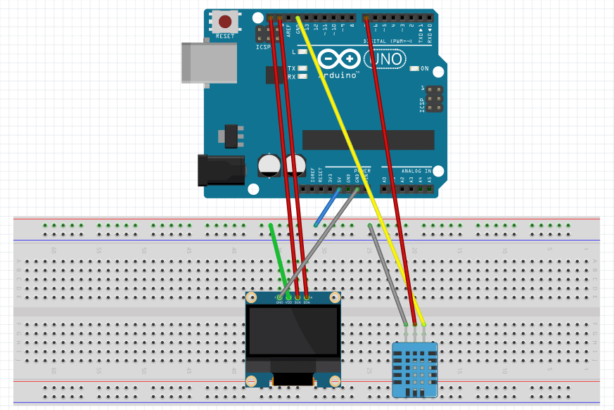 The connections from the OLED to the Arduino include SCL (Serial Clock) and SDA (Serial Data) to the identical pins on the Arduino, GND (Ground) to GND on the Arduino, and the VCC to the positive red rail on the breadboard. From the DHT11 to Arduino, I connected the negative pin to one of the GND pins, the sensor pin to digital pin 7, where the sensor will relay its readings, and the positive pin to the positive rail on the breadboard. Finally, the 5 volts pin on the Arduino goes to the positive rail to give power to everything connected on the row.